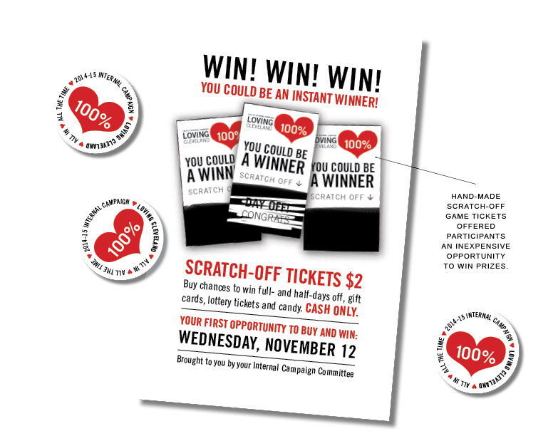 Every year United Way of Greater Cleveland enhances their work-place giving campaign by asking United Way employees to set a good example and make a pledge. Every year the internal campaign features a ton of fun activities and opportunities to give back to the community. The steering committee decided on a two facet theme. Everybody who works at United Way loves their hometown with all their heart and everybody who works at United Way will participate and contribute in some way. The $2 scratch off game tickets created an easy opportunity to win big without a large investment. This year I took the lead and created some interest through advertising posters, eblast graphics, scratch off game tickets and other communication efforts. D.J. Reichel Graphic Design for Communication & Style ©2018 All Rights Reserved