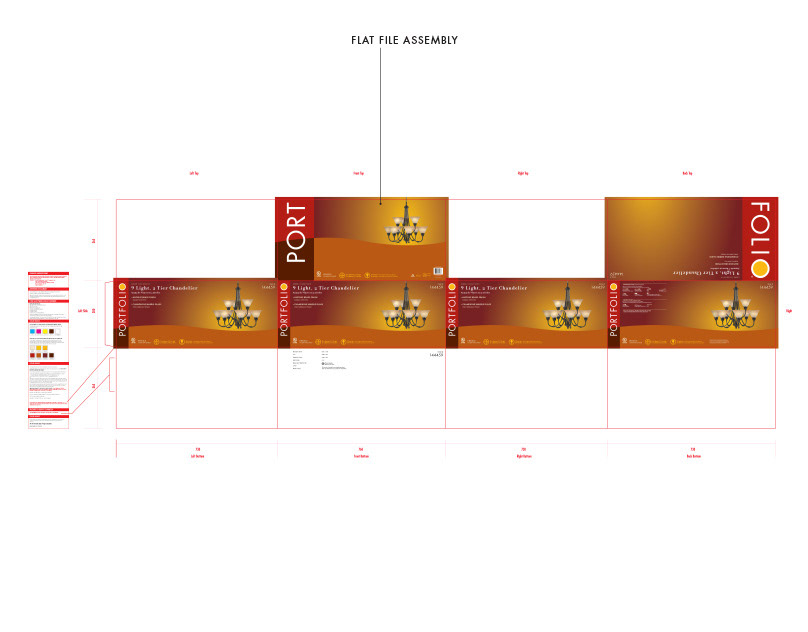 Portfolio Lighting products are an economy brand owned by Kichler Lighting and sold through Lowes stores. I did all the layouts for the various boxes while maintaining the approved design esthetic. As you can see below, the boxes come in a wide variety of shapes and sizes. My responsibilities involved processing Excel copy into Word docs sent to a translator for Spanish, drawing new die lines to fit supplied dimensions, copying background elements from approved file and fitting to the new box, up-dating and proofing copy in English and Spanish, sizing photos, making and sending pdf's for approval, and making changes and revisions when necessary. All the while maintaining proper layer structure within each Illustrator file and providing organized file management on the server. D.J. Reichel Graphic Design for Communication & Style ©2018 All Rights Reserved